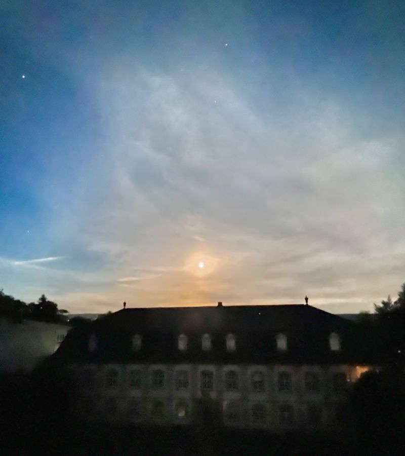 Am frühen Morgen des 15. Juni 2022 war der tiefste Vollmond des Jahres zu beobachten: nur ganze 12,5° kam der Mond über den Horizont bei uns. Ein Bild aus dem dem dritten Stock des Klosters heraus in Richtung Süden zeigt den Mond knapp über dem Bibliotheksbau stehend.