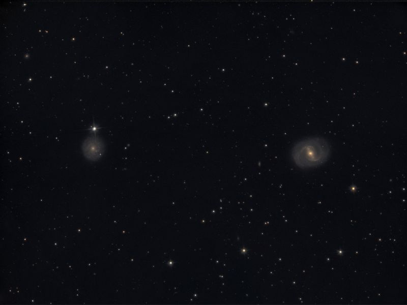 Es handelt sich dabei um eine schöne Balkenspirale, die visuell gerade so länglich in einem 20 cm Teleskop zu sehen ist. Die schöne Struktur wird allerdings erst auf einer längeren Belichtung deutlich. Auffällig ist die Unsymmetrie der beiden Arme mit ihren Dunkelstrukturen und einzelnen Knoten.