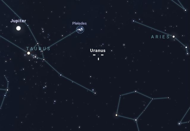 Auf dem Weg zurück ins Haus schaute ich noch - jetzt ohne jegliche Hilfsmittel - nach Uranus. Der weit außen stehende Planet war sehr schnell zu finden, da er sich im Moment in einer sternarmen Gegend zwischen den Sternbildern Stier und Widder, süd-westlich unterhalb der Plejaden, befindet. Wer bis Ende des Jahres 2024 in einer klaren Nacht Gelegenheit dazu hat, sollte einmal nach dem siebten Planeten des Sonnendsystems Ausschau halten.