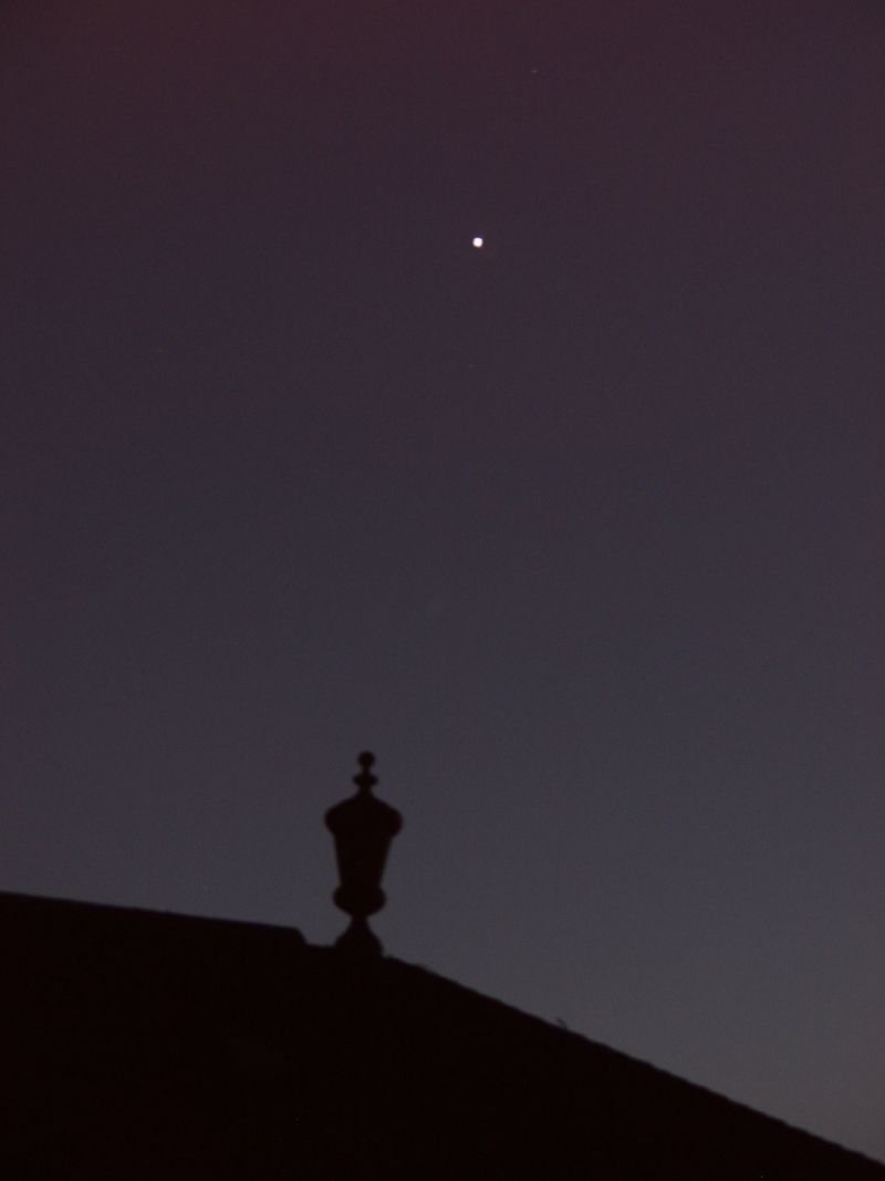 Ein anderer Planet ist noch tief am Dämmerungshimmel in etwas weiter westlicher Richtung auszumachen: Jupiter, den ich auf einem weiteren Bild in einem Baum fotografieren konnte. Beide Bilder kann man fast nebeneinander stellen. In der Mitte fehlt nur ein kleiner Teil für ein Überblicksbild.