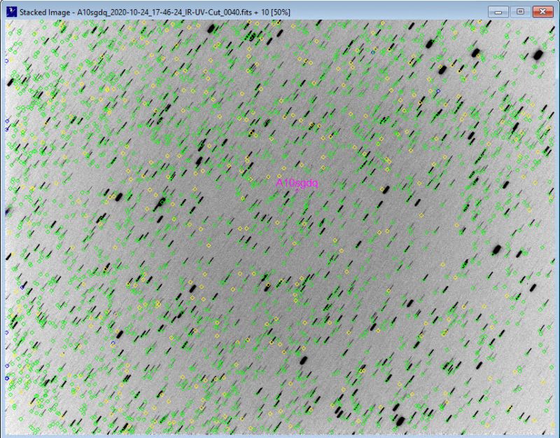 Im Bild oben ist der Asteroid mit dem Label "A10sgdq". Seine Position wurde genau vermessen. Die Sterne sind deshalb Striche, da 11 Bilder auf den sich bewegenden Asteroiden gemittelt wurden. Damit kann eine bessere Genauigkeit der Messung des Ortes am Himmel erreicht werden.