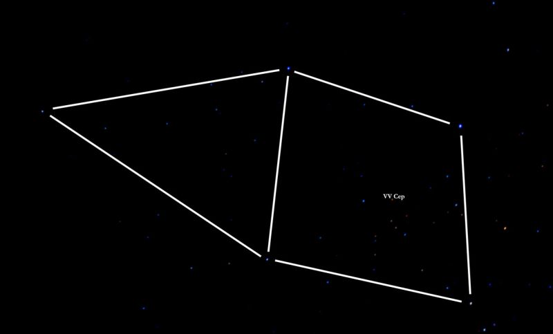 Das Sternbild Kepheus ist derzeit nach Einbruch der Dämmerung halb hoch im Nordosten zu finden. Es gleicht einem mit Strichen gezeichneten Haus, das quer liegt und dessen Spitze in Richtung Norden zeigt. VV Cep liegt ungefähr bei der "Haustüre". Die Gestalt des Königs Kepheus, die in der Sternkonstellation gesehen wurde, war in der Vorstellung in der Antike freichlich etwas schmuckreicher.