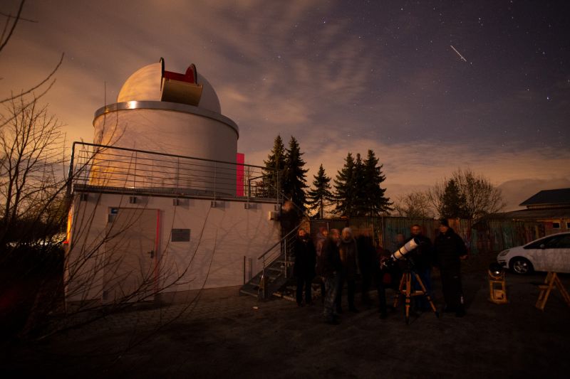 In der Sternwarten-Kuppel zeigten sich an den 180 mm Geräten der Orionnebel in seiner ganzen Pracht. Die Mondsichel stand ganz am Anfang schon im Okular und wurde mit dem Smartphone auch gleich "dingfest" gemacht. Später waren die Sterne im Refraktor "nadelfein" zu sehen, während im Menicas-Spiegelteleskop meist eher kleinere Vergrößerungen einen Überblick des gerade gezeigten Objekte verschaffte. Nach dem Highlight von Sternenstaub ging es an die Offenen Sternhaufen im Fuhrmann: M36 zunächst und dann M37. An NGC 2392 zeigte sich, wie ein ehemaliger Stern seine ehemalige Atmosphäre und damit schwerere Atome und Wasserstoffgas wieder ins Weltall zurück gibt für neue Sterne - und vielleicht auch Planeten, die sich daraus bilden können.