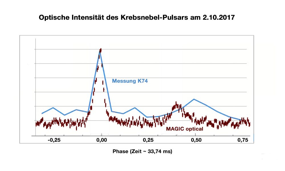 Es konnte allerdings nicht erklärt werden, warum die Messung des optischen MAGIC-Teleskops auf La Palma den Nebenpuls um ca. 3 ms früher verzeichnete als es die Aufnahmen in der Klostersternwarte zeigten.