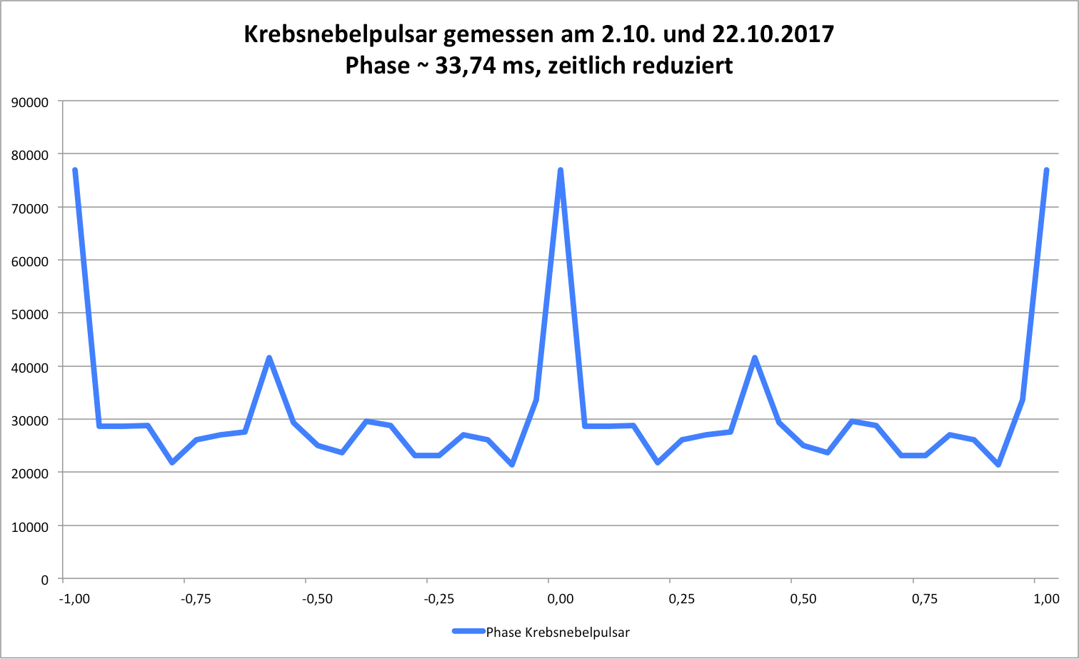 Die Analyse der Meßdaten, die bei der Beobachtung des Krebsnebelpulsars im Oktober 2017 in Münsterschwarzach gemacht wurden, offenbarte eine Reihe von überraschenden Ergebnissen. Durch das Video, das eigentlich zur Feststellung der genauen Eintreffzeit des Pulses des Krebsnebelpulsars gemacht wurde, konnte die genaue Rotationsfrequenz des Krebsnebelpulsars ermittelt werden.