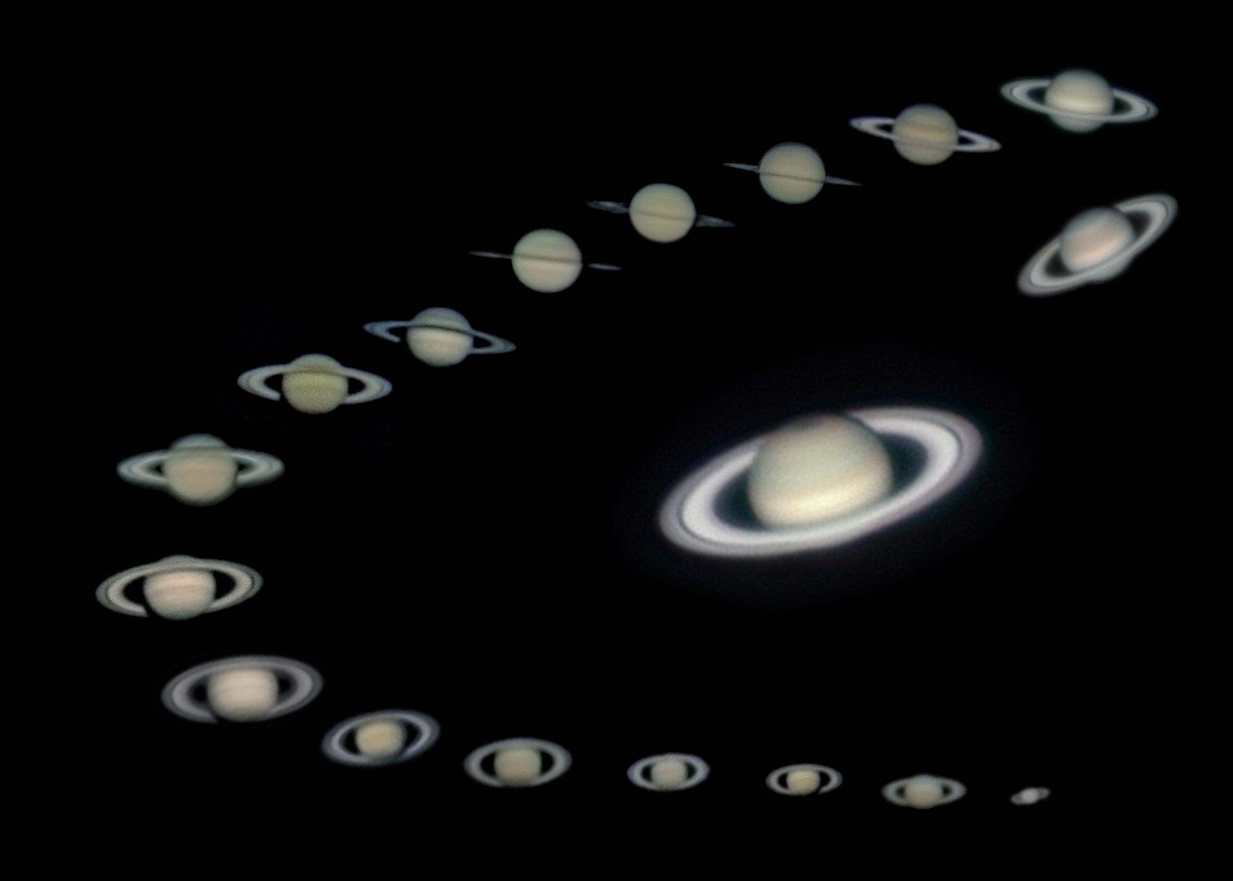 Im Sommer 1984 hatte ich mit mein erstes Bild von Saturn mit einem kleinen Spiegelteleskop und einer Spiegelreflex auf SW-Film gemacht. Nach einem Saturn"jahr" zeigt sich der Ringplanet nicht nur an der gleichen Position am Himmel, sondern auch mit der gleichen Stellung seines Ringsystems - und ließ sich von mir mit einer weitaus besseren Ausstattung fotografieren: einem 10" Newton und einer CCD-Kamera, die mit sehr kurzen Belichtungszeiten mit Bruchteilen einer Sekunde auskommt.